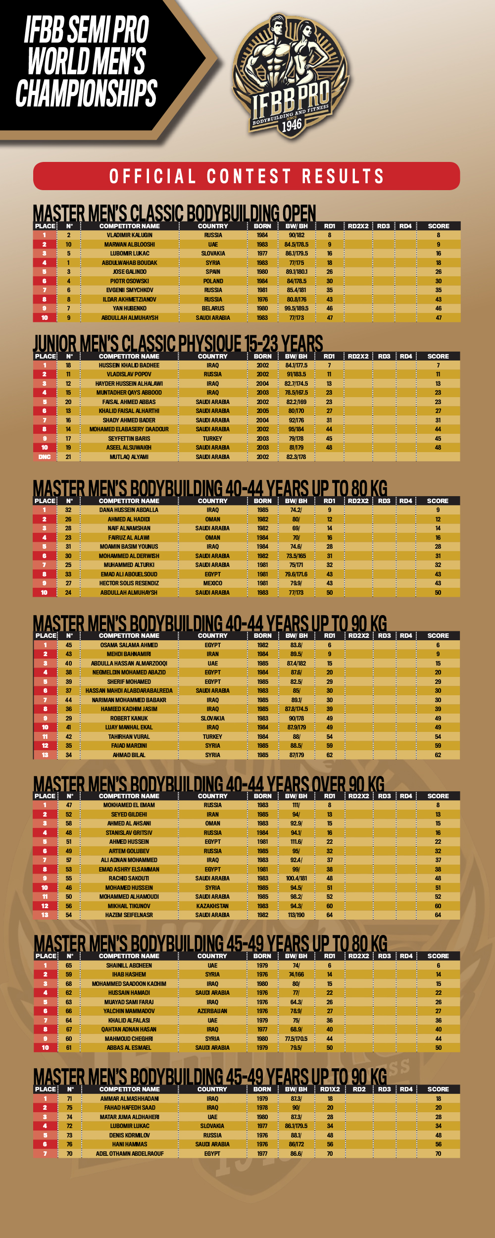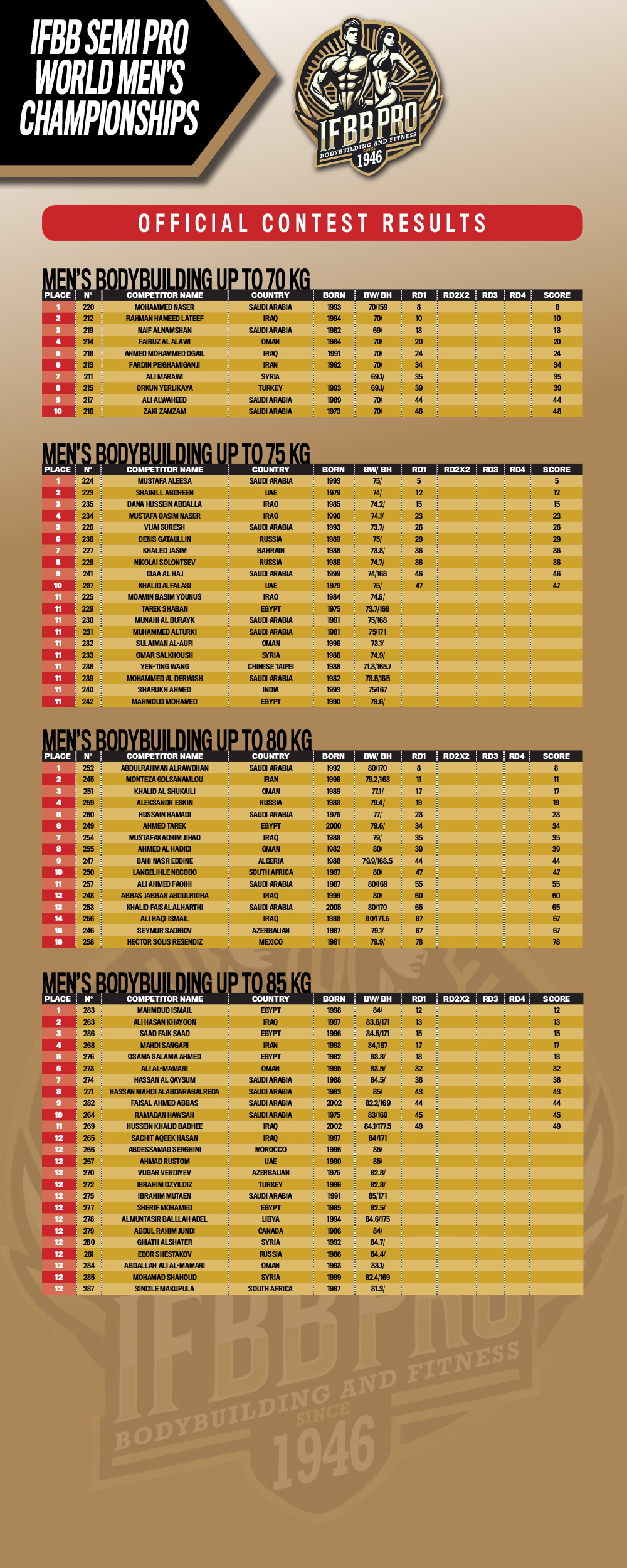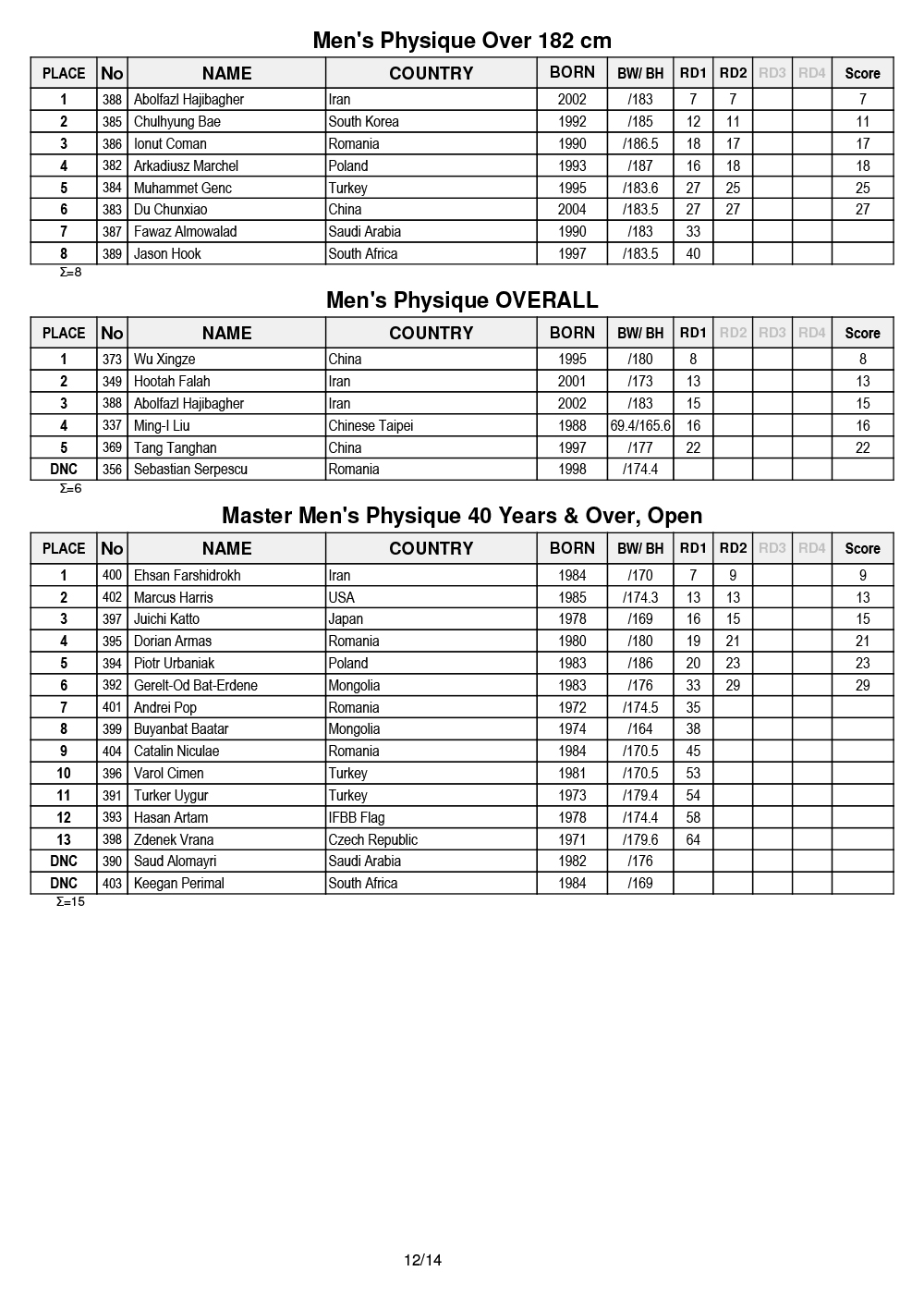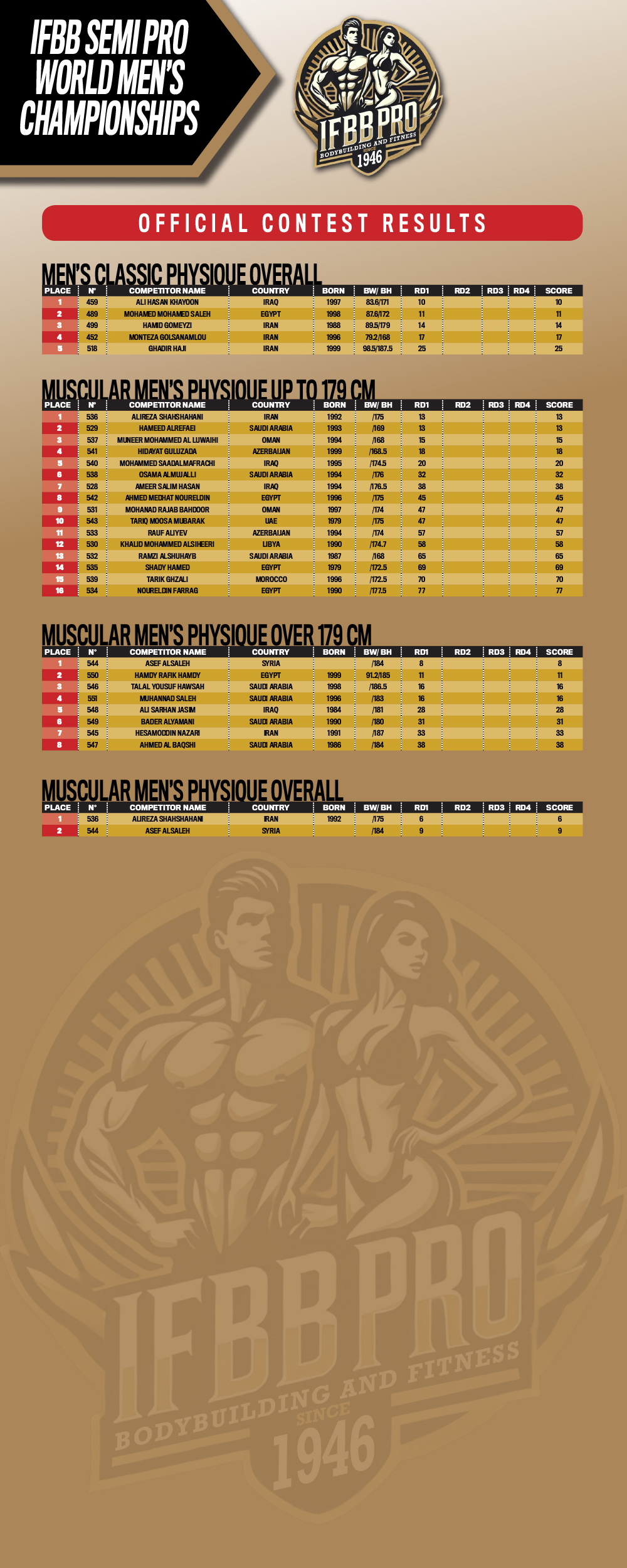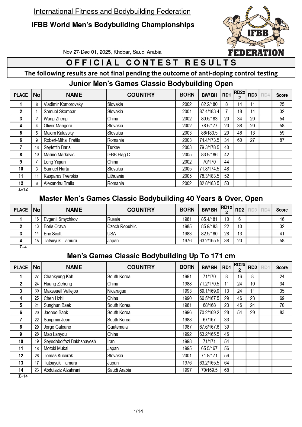 Протоколы: Протоколы: IFBB World Bodybuilding Championships - 2025